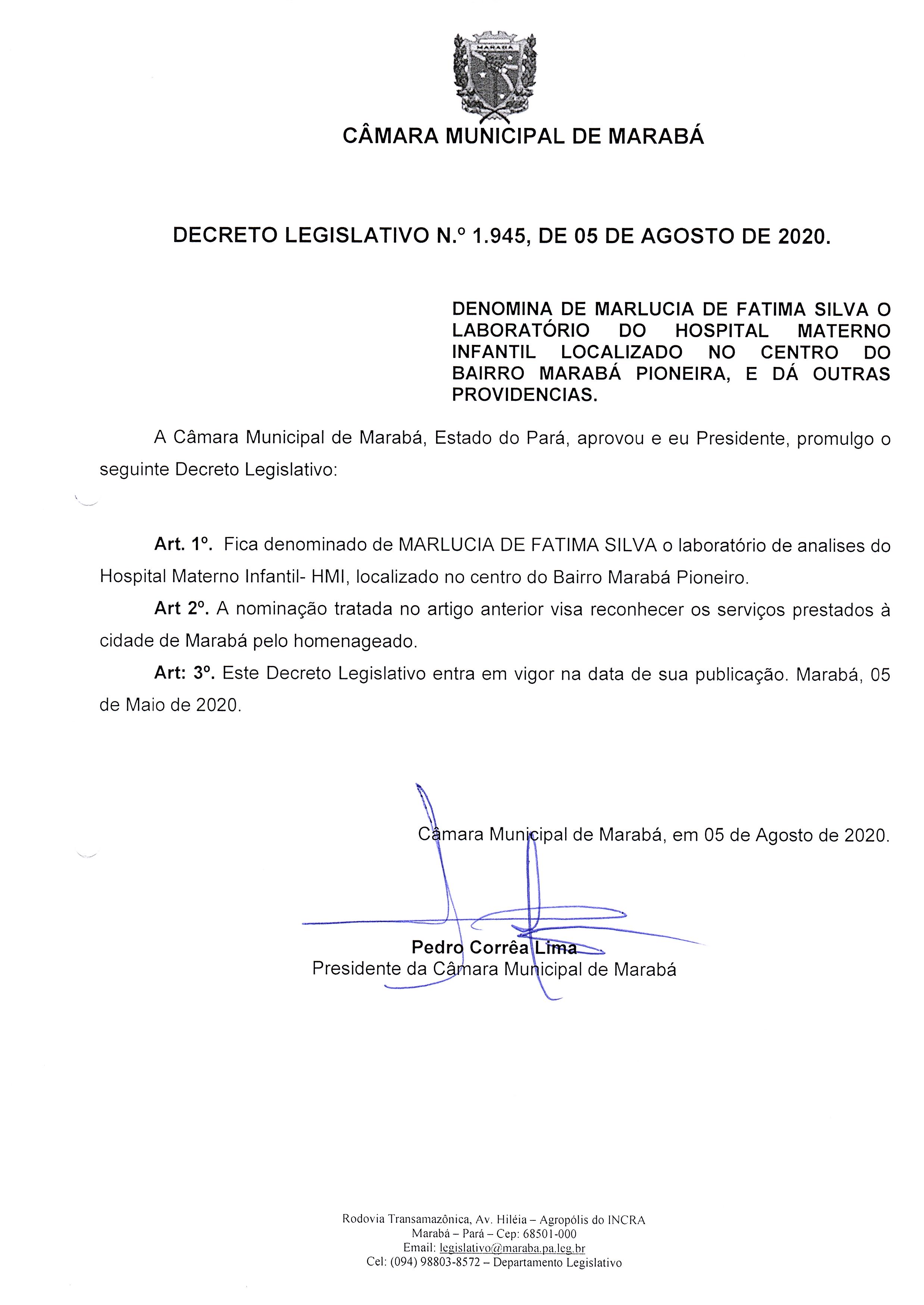 | Decreto Legislativo | 1945 | 2020 | 5 de Agosto de 2020 | DENOMINA DE MARLUCIA DE FATIMA SILVA O LABORATORIO DO HOSPITAL MATERNO INFANTIL LOCALIZADO NO CENTRO DO BAIRRO MARABA PIONEIRA E DA OUTRAS PROVIDENICAS. | Norma sem alterações posteriores. |